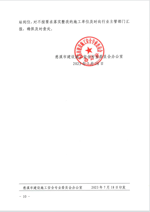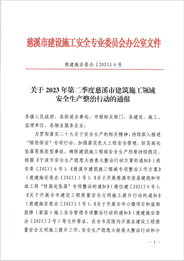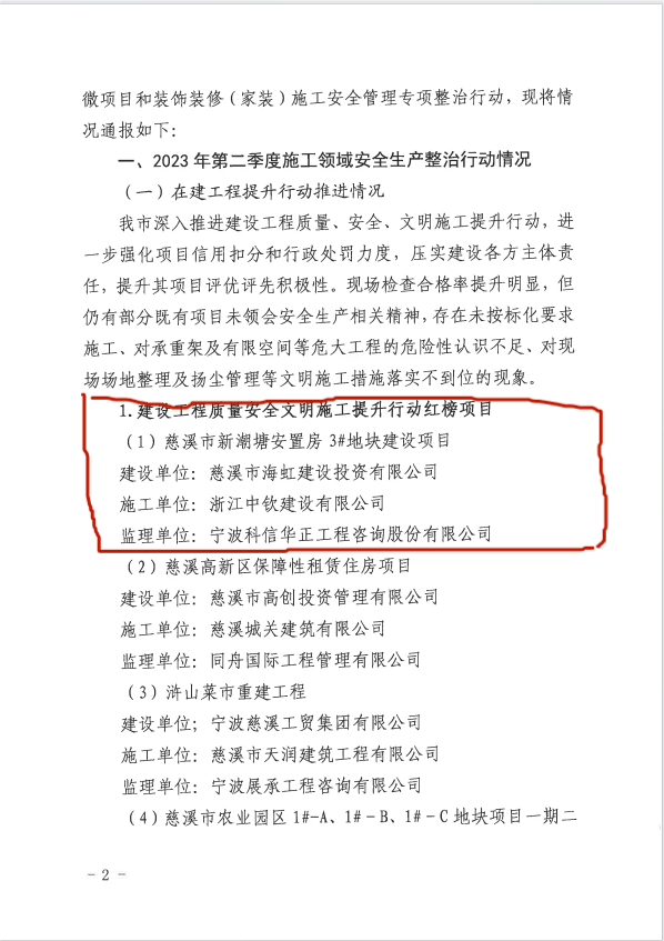 我司荣获“2023年第二季度慈溪市建设质量安全文明施工提升行动红榜“的通报