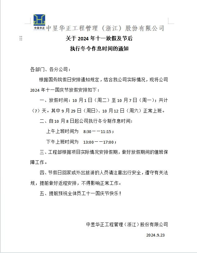 关于2024年十一放假及节后 执行冬令作息时间的通知