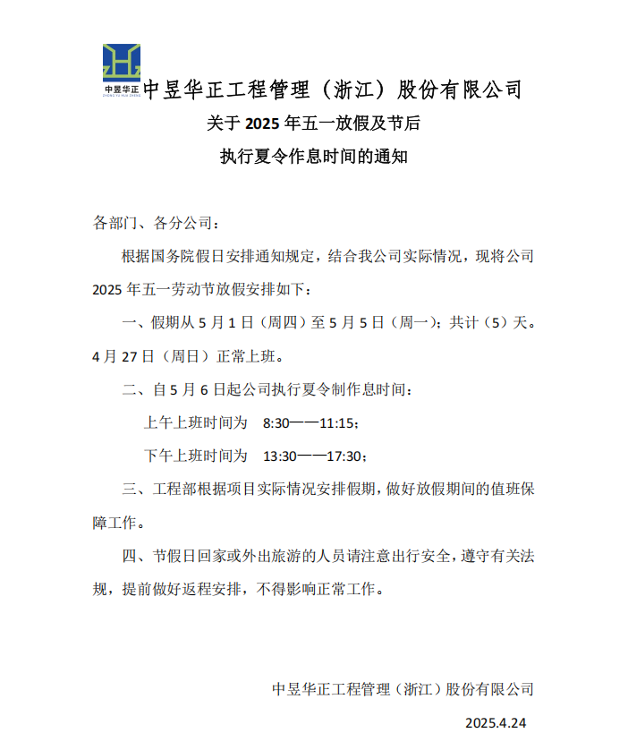 关于2025年五一放假及节后执行夏令作息时间的通知