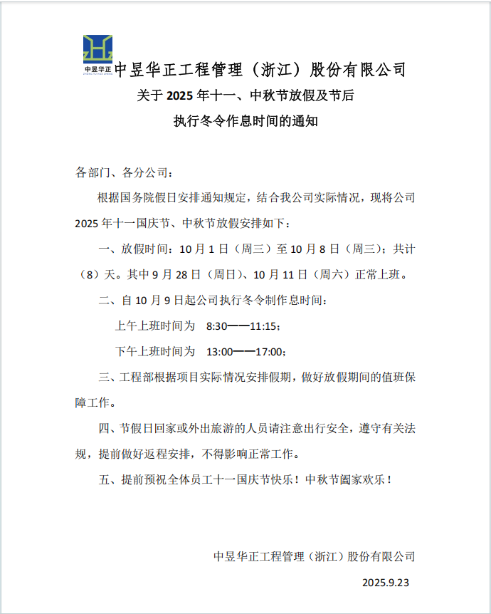 关于2025年十一、中秋节放假及节后执行冬令作息时间的通知